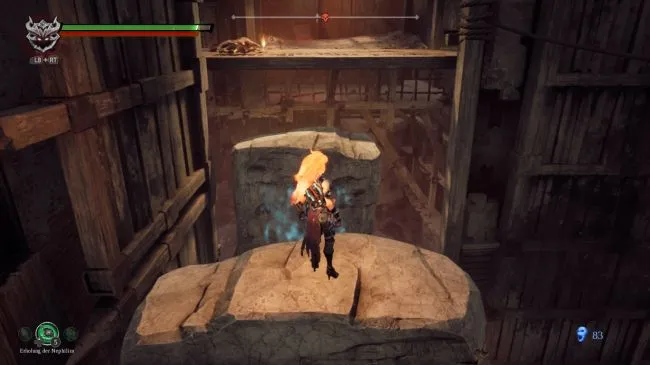 Теперь возникает вопрос: зачем забираться на один из этих кубоидов, если рано или поздно он все равно упадет в измельчительную машину? Просто сделайте это и сразу же посмотрите в направлении движения: прямо перед вами должна появиться платформа со светящимся сосудом Lurcher среднего размера. Перепрыгнуть на платформу нужно в последний момент, пока кубоид под ногами не оборвался. Если у Вас возникнут проблемы с выбором момента, заберитесь на заднюю часть двух кубоидов и прыгните сразу после того, как передний кубоид опрокинется у Вас на глазах.