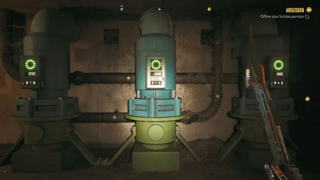 Затем прикрепите поворотное колесо к соответствующему вентилю и взаимодействуйте с ним, чтобы создать давление 10 для контейнера № 1. Чтобы создать давление 75 для контейнера № 2, быстро взаимодействуйте с клапаном напротив контейнера (45) и клапаном в соседней комнате (20). Наконец, для контейнера № 3 необходимо давление 45, для чего нужно снова закрыть первый клапан (10), а затем задействовать клапан напротив контейнера (45). После этого можно продолжить путь.