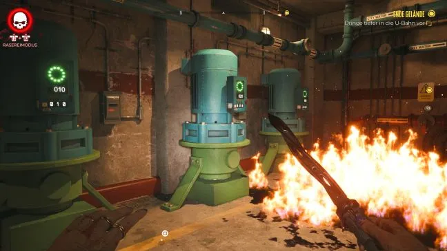 В подземном тоннеле довольно рано приходится снова играть в старую игру с давлением. Сначала получите доступ в небольшую закрытую зону, уничтожив ящики на ограждении. За ней возьмите с собой вентильное колесо и вставьте его рядом с вентилем газопровода. Затем отключите газ и потушите пожар рядом с резервуарами химической бомбой. Теперь вы можете спокойно добраться до рычага бензопровода с цифрой 10 и взаимодействовать с ним. На этом первый бак закончен.