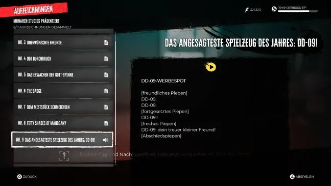 № 9 - Самая горячая игрушка года DD-09: На конспиративной квартире Monarch Studios, т.е. там, где верстак и точка быстрого перемещения, есть трейлер, и в этом самом трейлере висит плакат, взаимодействуя с которым можно разблокировать это голосовое сообщение.