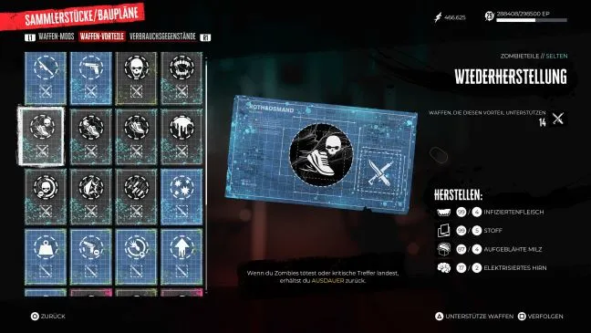 - Эффект: убив зомби, вы получаете небольшое повышение мобильности. Этот эффект можно складывать несколько раз.