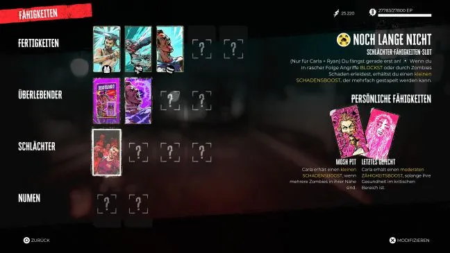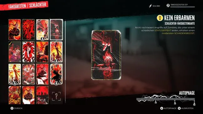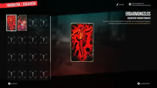 Беспощадный: Получается автоматически при достижении персонажем 10-го уровня. Благодаря этой карте вы неудержимы, атаки на поверженных зомби дают вам небольшую прибавку к урону.