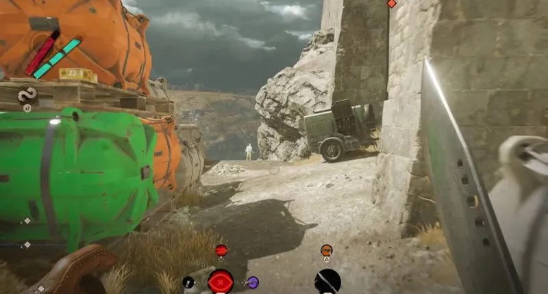 Сверните на правый выход из туннеля и сразу же найдите станцию доставки с правой стороны. Сразу за ним снова держитесь правее и идите прямо между скалой и контейнером. Через несколько метров вы попадете на большую территорию с контейнерами и строительной техникой.