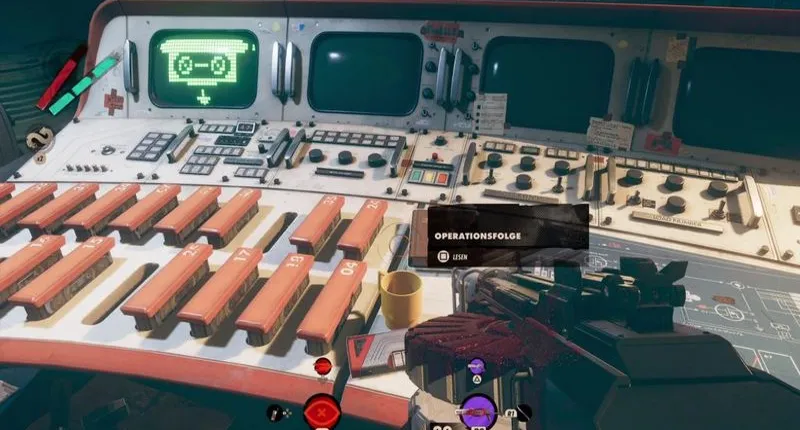 Если быть точным, вы видите четыре экрана и широкий стол с несколькими кассетами с данными. Они пронумерованы и могут быть нажаты, после чего на одном из экранов появляется символ. Теперь вы должны найти четыре правильные кассеты и выбрать их в правильном порядке.
