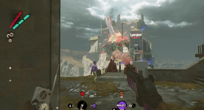 Поэтому у вас нет другого выбора, кроме как пройти по мосту и по пути уничтожить охранника. На другой стороне, не обращая внимания на фиолетовый дым, поднимитесь по лестнице в задней левой части. Вы наткнетесь на дверь, которая либо открыта, либо закрыта. В последнем случае просто пробегите мимо него и держитесь левее в следующей комнате, пока не достигнете выхода, заколоченного досками. Вы можете сразу же разрубить их своим мачете, что, конечно, вызовет переполох, поэтому бегите обратно к мосту, укройтесь там и выстрелите несколько раз, чтобы заманить врагов к себе.