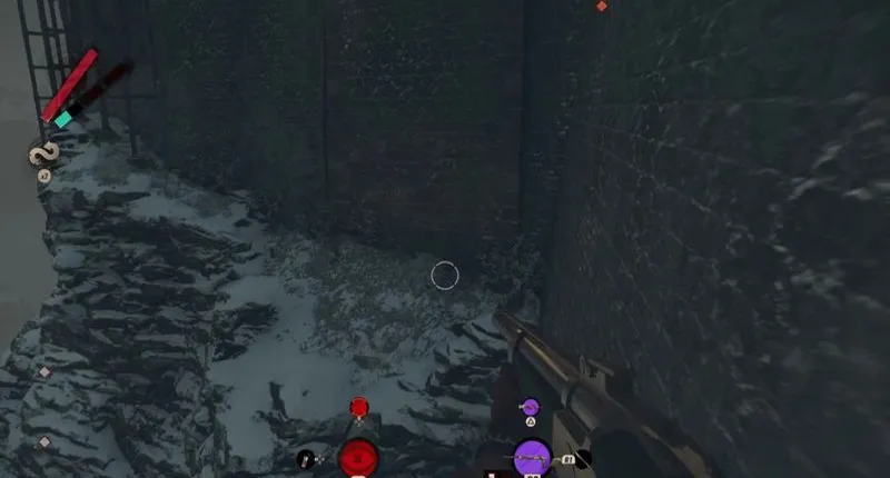 На веранде есть еще одна дверь, которую вы должны полностью игнорировать. Вместо этого спуститесь с другой стороны на широкую и заснеженную платформу. Затем идите вдоль внешней стены, пока не окажетесь в предполагаемом тупике. Однако вам нужно просто посмотреть вверх и забраться на узкий выступ, который приведет вас к паре окон.