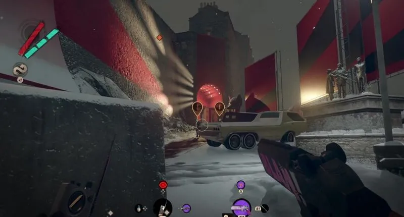 Попасть туда довольно просто: нужно, как обычно, пройти из туннелей в сторону библиотеки и выйти на знакомую боковую аллею, которая граничит с вашим номером люкс. Продолжайте двигаться прямо до площади Дорси. Оказавшись там, сориентируйтесь по медпункту и посмотрите вверх по улице по диагонали направо. Вы должны заметить пару охранников в волчьих масках, стоящих перед светящимся красным входом в поместье. Также очень близко к ним находится баллистическая пушка, которую почти не видно из-за припаркованного перед ней автомобиля.