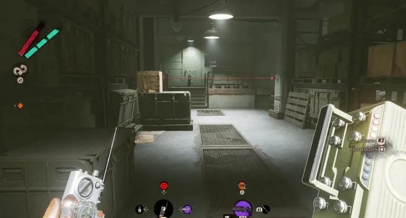 Возьмите батарейку, которую вы в последний раз вставили в гнездо цилиндрической камеры, снова пересеките проход и наполовину прицельтесь в лестницу, ведущую вниз. На нижнем этаже вам нужно взломать следующие лазерные мины, а также исследовать комнату справа от вас, чтобы быть на безопасной стороне. Там все еще могут быть враги, если только вы не смогли прицелиться и выстрелить в них через большое отверстие в полу ранее.