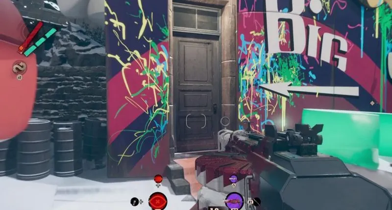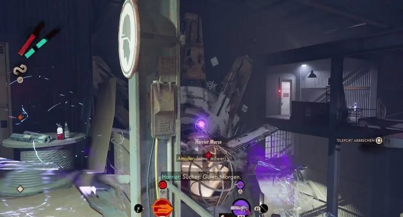 Теперь осторожно идите вперед, пока не сможете прицелиться в купол слева от вас, где стоит Гарриет. Используйте свою способность телепортации и прыгните вместе с ней на купол. Затем поверните налево и снова используйте телепорт, чтобы прыгнуть в открытое окно. Лазерные мины можно игнорировать.