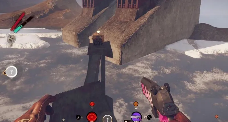 Наконец, спуститесь обратно в центр оружейной и бегите направо к восточному туннелю и станции доставки. Как только вы пройдете наклонную каменную стену, поверните резко направо и загляните в пропасть, где вы должны увидеть пистолет. Теперь вам нужно спрыгнуть на него вниз, и лучше всего заранее сделать себя невидимым, чтобы он не раздавил вас. Прямо рядом с пистолетом находится четвертый ящик.