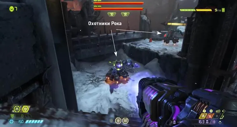 На третьем этапе, после победы над Охотником Рока, вам нужно спрыгнуть в отверстие, находящееся в центре зала. Вы попадете на ледяную площадку, которая станет финальной в битве. На ней вас будут ждать два Охотника Рока. Снова выбираете Плазменное ружье и начинаете действовать, как описано в первом этапе выше.