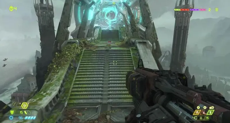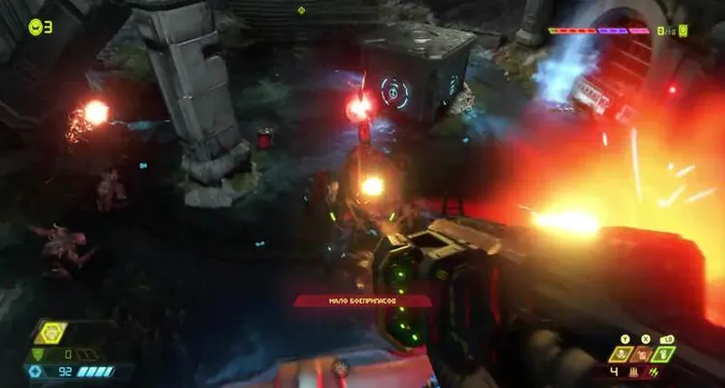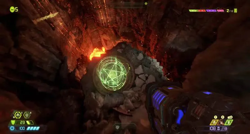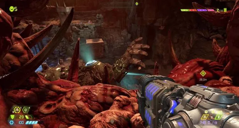 Пройдя трое ворот доходим до очередных статуй, за которым спрыгиваем вниз, где нужно уничтожить всех демонов, пару Арахнотронов и Рыцаря ада. Над пропастью можно найти броню.