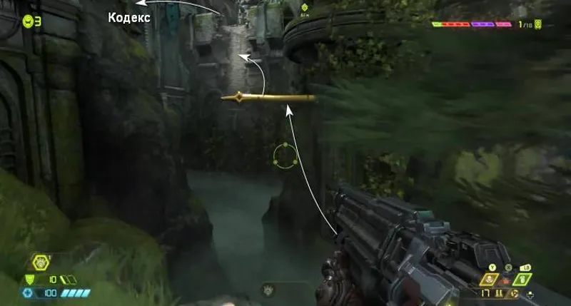 Через мост доходим до зала с крутящимся механизмом, через который нужно пробежать. У обрыва слева находим броню. Для подъема наверх, нужно подвинуть ящик. Затем разбиваем три опоры, и на последнем балконе находим еще кодекс. После отключения механизма в зале подбираем Бустер (позволяет ускорятся, активируется клавишей «Shift»).
