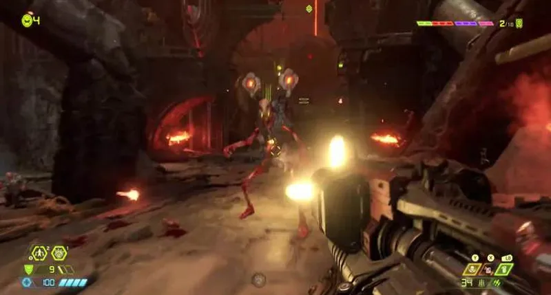 Противником выступает летающий скелет – Ревенант, выпускающий самонаводящиеся ракеты. Целиться лучше в его пушки, расположенные рядом с головой. После упокоения противника идем вправо, и, подобрав автокарту, попадаем в кровавую пещеру, пол которой залит водой.