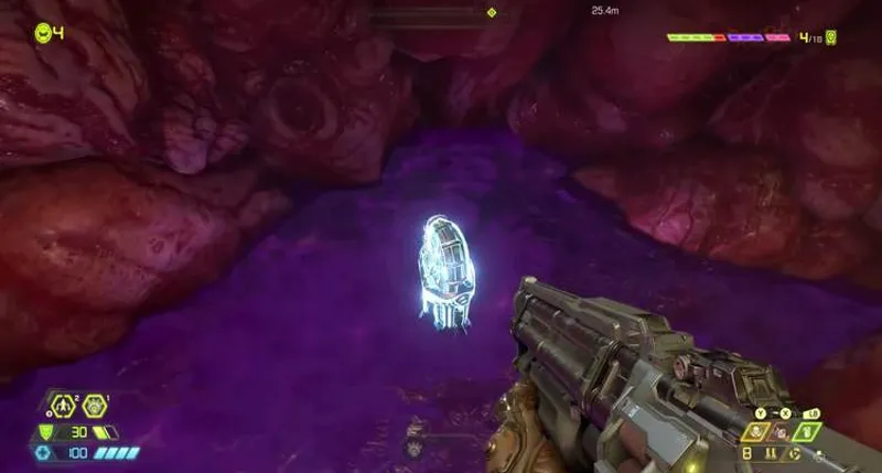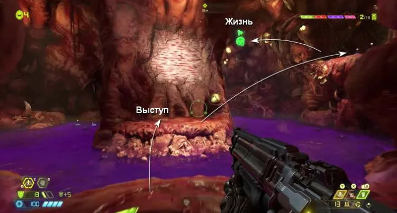 Увернувшись от появляющихся Щупалец доходим до серой стены, и отталкиваемся от нее вправо, чтобы найти Модификацию, а посмотрев наверх, можно обнаружить дополнительную +1 к жизни. Выходим из пещеры, подбираем реактор, и вставляем его в пушку снаружи, чтобы открыть еще одну пещеру.