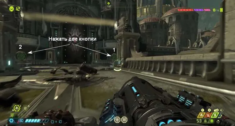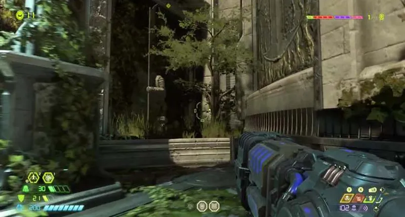 Во дворе произойдёт сражение с танком. В помощь предусмотрены снаряды BFG, что расположены на балконе. Под площадкой есть дополнительная жизнь. Рядом – кодекс. Когда одержаны победы, то важно оперативно зажать две кнопки: 1 – за решёткой снизу, а 2 – на зелёном балконе.