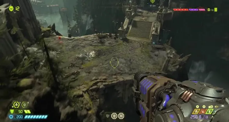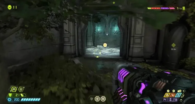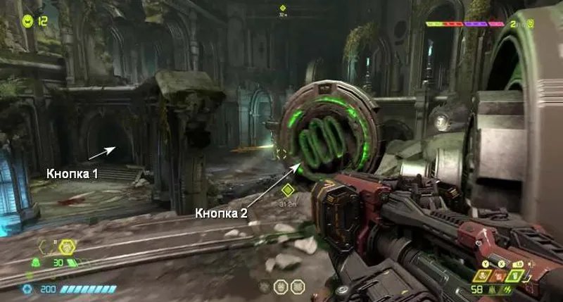 Далее перепрыгивают пропасть. В полу располагается яма, в которой игрока ждёт ещё одна жизнь. Красная печать и очередной кодекс ждут в здании слева. Дверь открывается с помощью выстрела. Важно нажать на кнопку, представленную в виде квадрата.