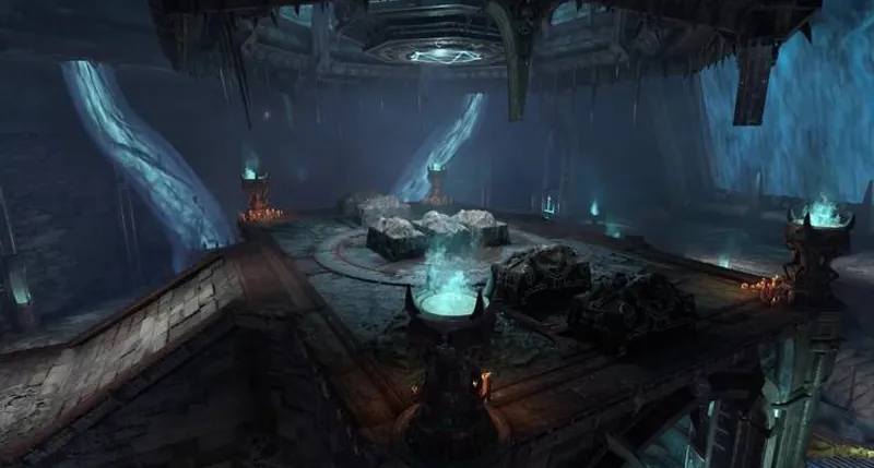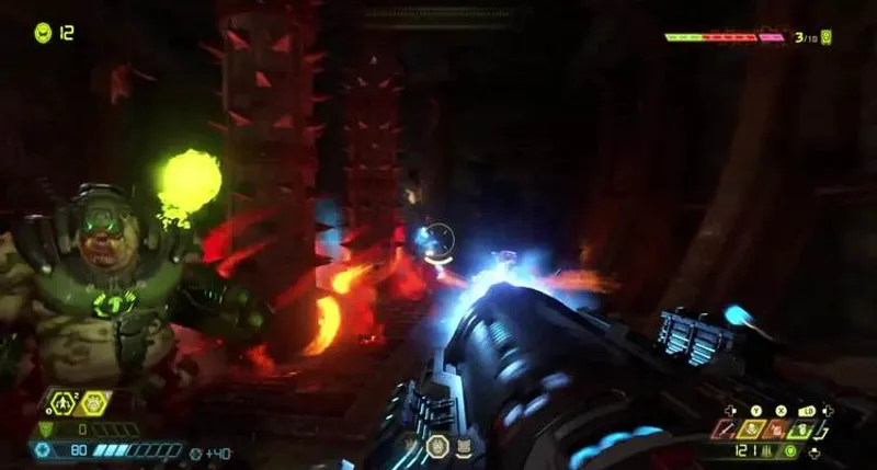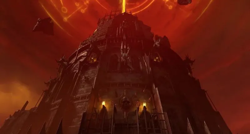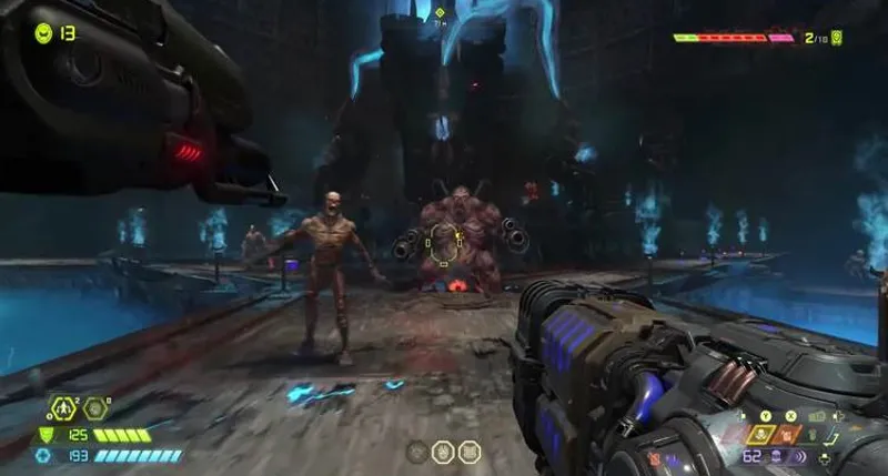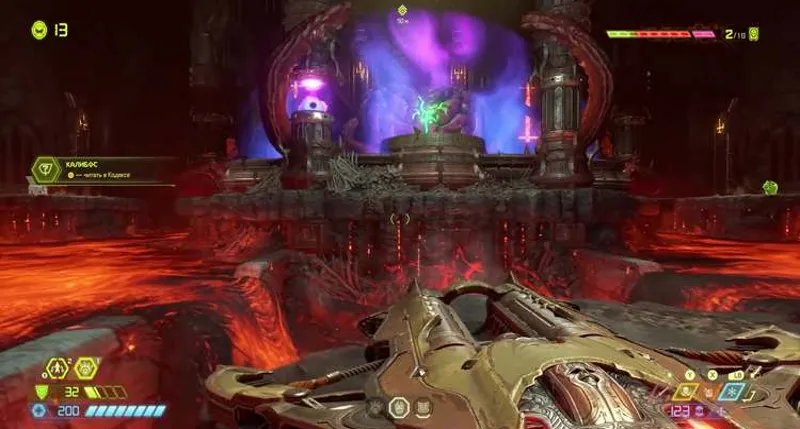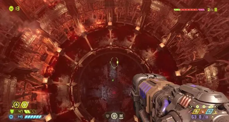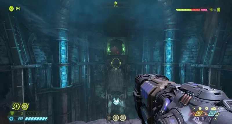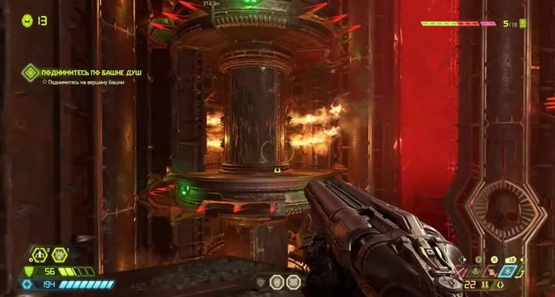 Находимся в зале с двумя кружащимися столпами. Используем наряды BFG. Самым первым нужно убить призывателя, который окажется наверху. После этого, прыгаем в яму и хватаемся за стену.