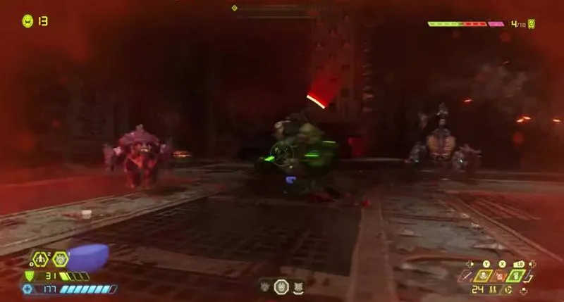 Перед нами здоровенный мозг. На некоторое время в колоннах открываются глаза, по ним нужно стрелять. Необходимо постоянно передвигаться, потому что островки под ногами постепенно утопают в лаве. В концовке наносит удар по мозгу.