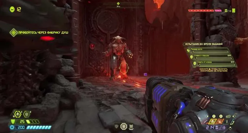 По левую сторону от закрытых ворот находится два пресса, проходим через них. Натыкаемся на очередную группу демонов. Находим второй кодекс, он спрятан в тупике. После этого, жмём вторую кнопку.