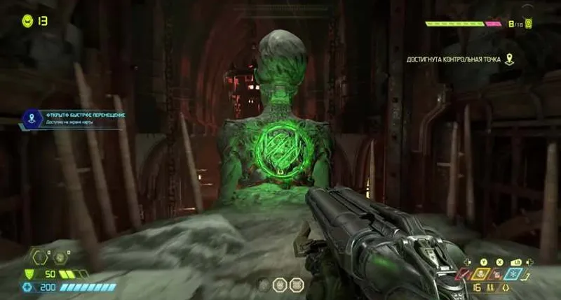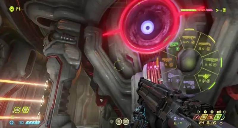 Поднимаемся, делаем дыру в зелёной стене и проходим. Забираемся на верхний этаж. Пробираемся около лазеров, в центральном строении замечаем два глаза возле потолка, стреляем в них. На выходе находим заряд Горнила. Проходим в очередной лифт.