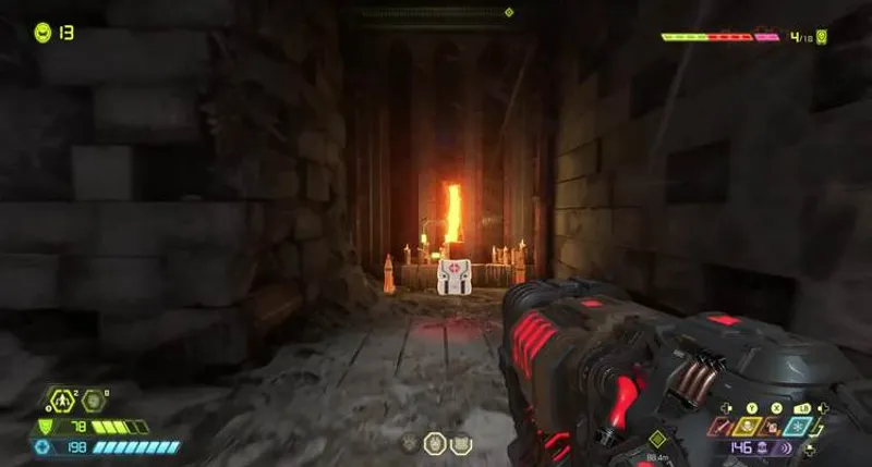 Вначале подбираем припасы BFG. Под пружиной находится заряд Горнила. При помощи пружин и карабканью по перекладинам добираемся до балкона возле самого потолка и находим +1 жизнь.
