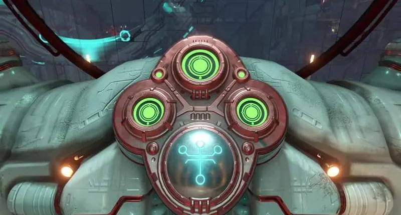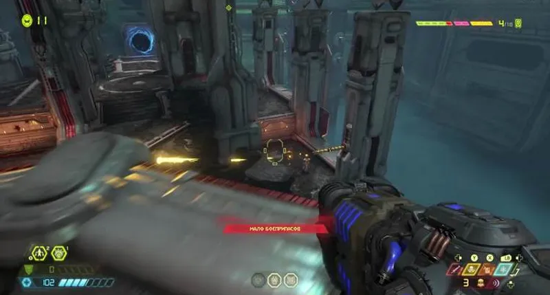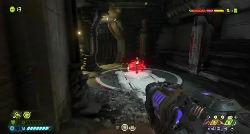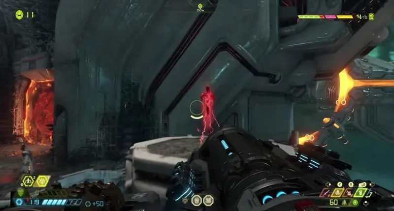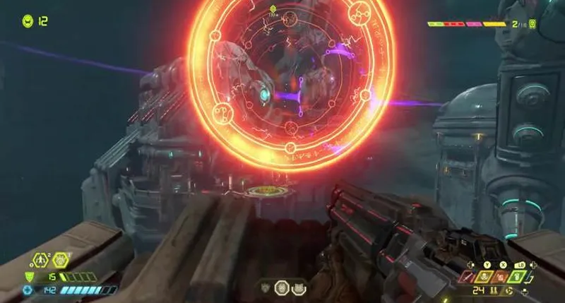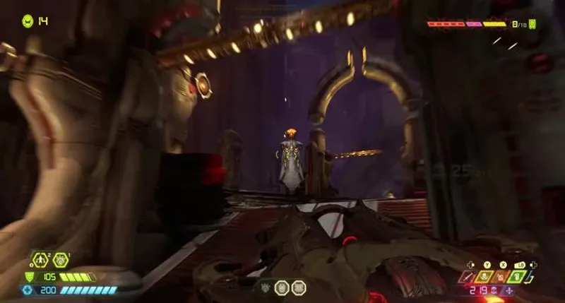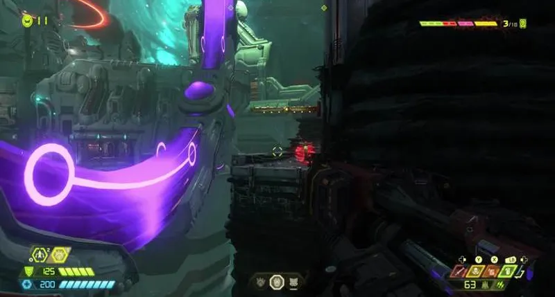Здесь придется вступить в бой с разными видами демонов. На центральном острове ждет заряд Горнила. Перепрыгиваем через ускоритель, зацепляемся за стену. Далее прыгаем по двум саркофагам. В итоге стреляем по зеленой мишени, запрыгиваем на возникший балкон. Нужно делать рывок в самый последний момент, чтобы удлинить полет. Затем активируем третий пульт, заходим в лифт и поднимаемся выше.