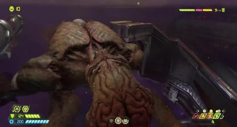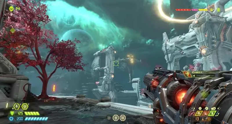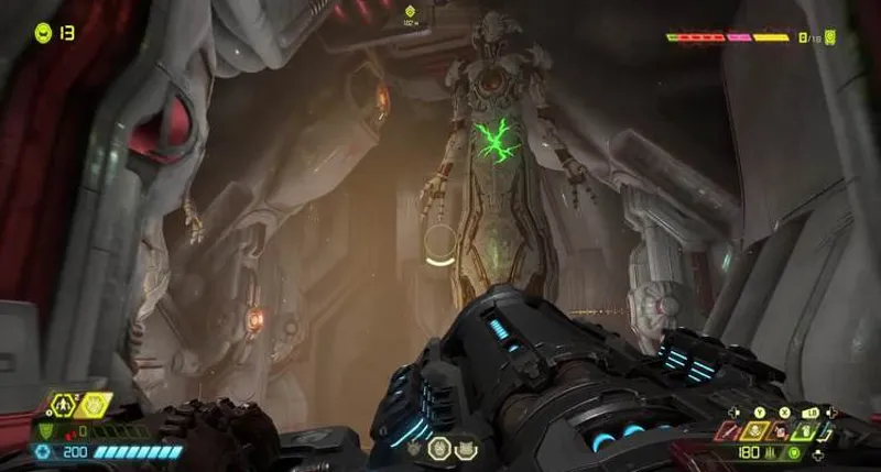 Босс Созидательница Кан. Проходим сражение со старшим ангелом. Важно уклоняться от ее стреляющих перьев. Можно обстрелять Кан из укрытия. Победить ее стоит, отбавляя постепенно здоровье. Она свалится на землю, в этот момент подшагиваем ближе и бьем. Повтор – 6 раз. На самой арене найдутся заряды BFG. Из помирающей Созидательницы выйдет энергетический шар, она окончательно погибнет.