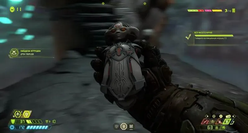 Выходим на балкон – там есть зеленая кнопка. Делаем перелет на следующее поле арены. По центру стоят заряды BFG. Убиваем призывающего демона, проходим мимо закрытого здания, находим кодекс в тупичке. Если залезть на балкон – найдется игрушка.