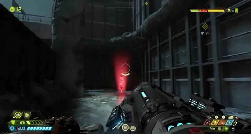Демон-гигант разрушил еще одно здание, и теперь у нас появилась возможность перебраться туда. Прыгаем на выступ с зеленой полосой этажом ниже. Проходим по подвешенным мостикам и попадаем на новую арену. Подбираем снаряды для BFG в левом углу разрушенного коридора.