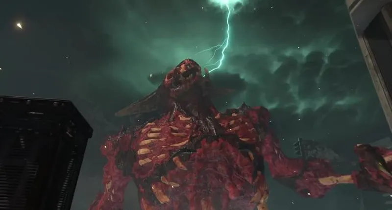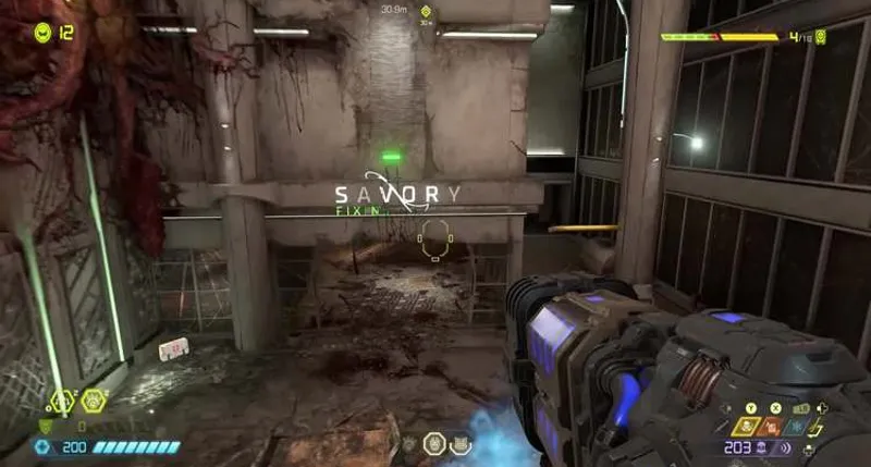 В здании напротив очень много неприятных демонов, в том числе бароны и титаны. Используем BFG 9000 и сразу же подбираем новый снаряд. После того, как уничтожим несколько обычных врагов, на втором этаже появится тотем жестокости, рядом с большой колонной у окна. По серой стене над вывеской «SAVORY» поднимаемся на следующий этаж с демонами.