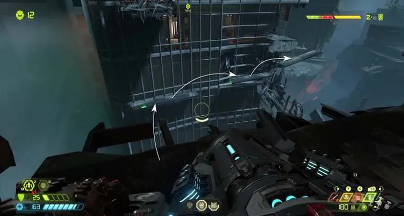 Оттолкнувшись от двух серых стен, рядом с парковкой, попадем в торговый центр. Стреляем в зеленую метку через щель между сломанными дверями. Поднимаемся наверх через шахту лифта. Читаем последний листок кодекса.