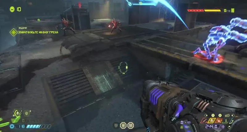 Выходим из секретной комнаты и перепрыгиваем в здание, напротив. На арене множество волн с самыми разными демонами, в конце битвы начинают появляться плети с хлыстами-лезвиями. На центральной платформе находится заряд Горнила, а на самом верху, среди крыш стоит автокарта. После зачистки территории можем двигаться на многоэтажную парковку. Лучше предварительно перестрелять противников из оружия.