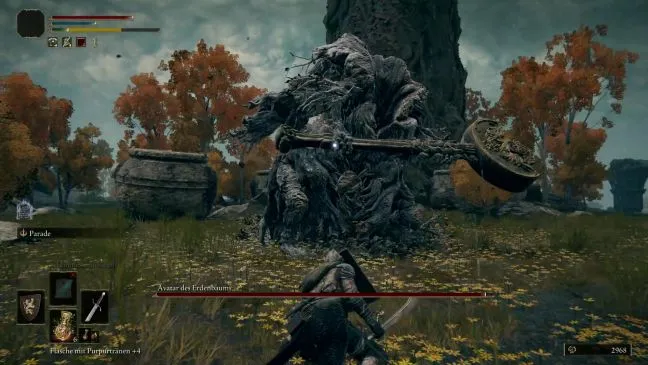 - Земляное дерево слегка приподнимает руки и держит свое оружие под небольшим углом вниз. Вскоре за этим следует боковой удар, который разворачивает его в Вашу сторону. Здесь следует блокировать, чтобы подстраховаться, и в последний момент уклониться в сторону. Внимание: иногда сразу же следует второй боковой удар, но в противоположном направлении. Поэтому воздержитесь от контратаки и будьте готовы к прыжку.