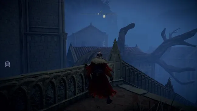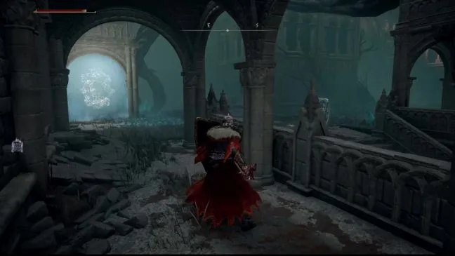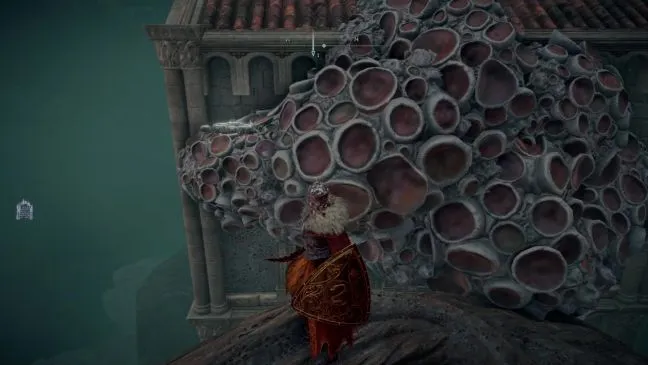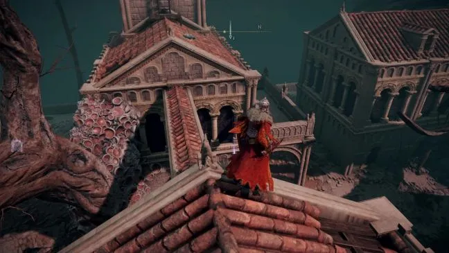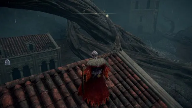 Далее у вас есть две ветки, по которым можно обойти здание. Выберите левую, более тонкую, и прицельтесь в следующее здание на западе. Оттуда вы можете прицелиться в белого светящегося скарабея, которого лучше всего подстрелить заклинанием или стрелой и получить Пепел войны: Двойной разрез.