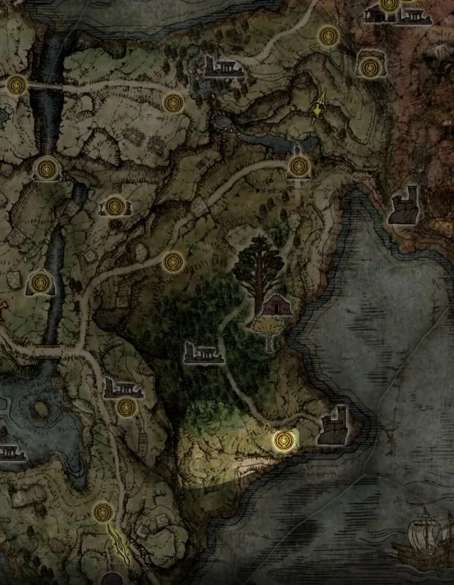 Также осмотрите сам монолит и изучите чашу с огнем, которую можно зажечь одним щелчком мыши. Строго говоря, всего таких чаш шесть, и все они должны сгореть и таким образом разблокировать следующий бой с боссом. Мы также отметили расположение чаш на карте: первые три находятся довольно близко друг к другу: