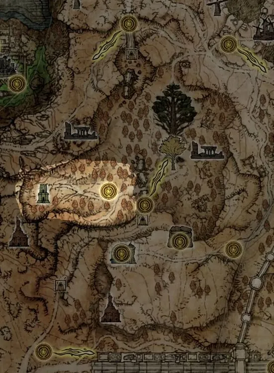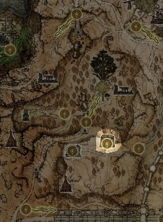 На обзорной карте вы также увидите Низкоземное дерево, которое находится к северу от дороги. На этом месте нужно убить небольшую группу врагов, чтобы добраться до слезы треснувшей ветки и слезы багрового кристалла.
