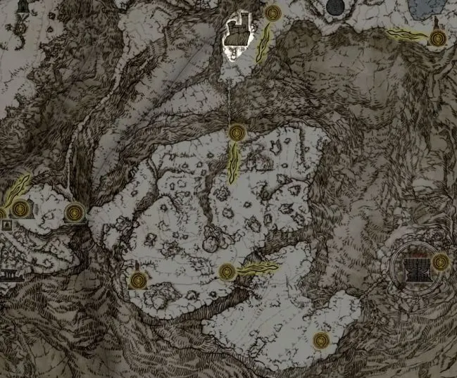 - К востоку от точки милосердия Внутреннего освященного снежного поля можно исследовать еще две платформы, на которых, с одной стороны, находится Радагон Красного Волка, а с другой - несколько крупных орбов с лицами магов. С одной стороны они охраняют Shimmerstone Mason's Manual [8], а с другой - Albinaurian Tower, о которой мы расскажем несколько страниц спустя.