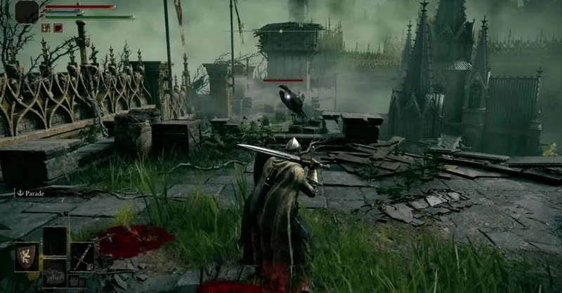 Теперь встаньте перед выходом на северо-восточной стороне и посмотрите вниз: Вы увидите перед собой широкую крышу и, возможно, несколько пятен крови, если активирован онлайн-режим. Имейте в виду, что вам предстоит неприятная битва. Точнее, прямо под выходом висит орел-гриф, который обладает значительно большей выносливостью, чем его собратья, и вдобавок плюется огнем. В любом случае старайтесь держаться поближе к нему, подныривайте под его атаки и контратакуйте.