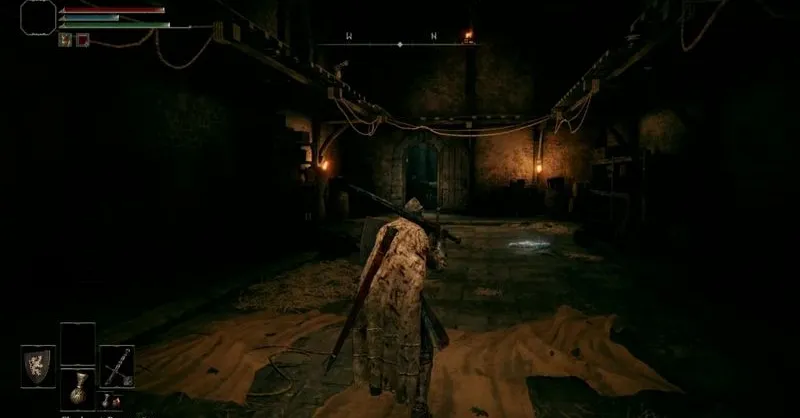 Пройдите от точки милосердия Валтурма обратно к шахте лифта. Прежде чем подняться по лестнице, ведущей наверх, осторожно перепрыгните через шахту, а также через щель в земле и возьмите огненное сало со шнуром. Если вы поднялись наверх, вам нужно остерегаться двух врагов одновременно: Один стоит в центре и стреляет в вас из арбалета. Другой подходит к вам с юга и атакует вас своим мечом.