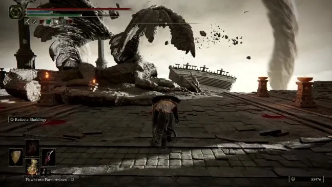 В северо-западном углу Вы должны увидеть следующую упавшую лампу и пройти между двумя столбами справа от нее. За ними вы сможете спрыгнуть на широкую тропу и пересечь темное подземелье с многочисленными статуями драконов. Пройдите полностью мимо него, обращая внимание как на узкий проход, так и на широкую лестницу, мимо которой вы автоматически пройдете. Прежде чем свернуть на одну из этих тропинок, дойдите до упавшей колонны (за которой, кстати, лежит камень кузнеца [7]) и поверните налево. Теперь вы должны стоять перед узким, разрушающимся уступом, который приведет вас влево к двум врагам и нескольким молниям.