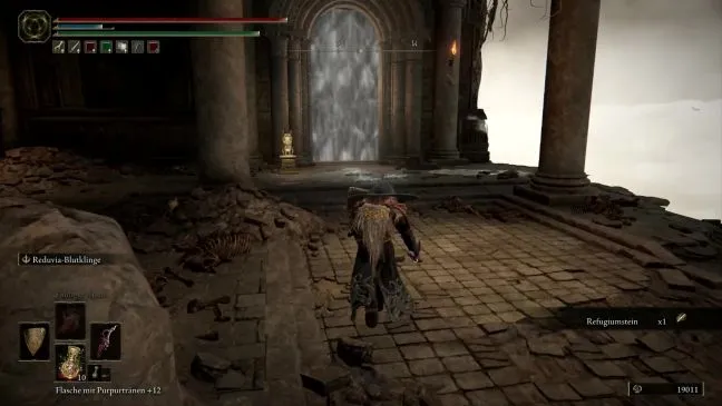 На фрагменте стены вы, похоже, оказались в тупике, так как все остальные платформы вокруг вас находятся слишком далеко для прыжка. Вместо этого следует присмотреться к неглубоким углублениям в виде окон: В большинстве из них лежит скелет или обломки колонны, за исключением той, что находится в центре. Если вы встанете в это пустое углубление, то сможете воспользоваться действием "Лечь". Нажав на нее, вы перенесетесь на арену с повелителем драконов Плацидусаксом.