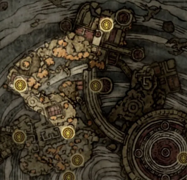 Сначала активируйте точку Leyndell, Ashen Capital mercy впереди себя и осмотритесь. Если вы пойдете на юг, то наткнетесь на широкую и глубокую лощину, в которую можно спуститься. На дне обратите внимание на неповрежденные и открытые ворота здания с северо-западной стороны, за которыми вы увидите Пятнистый Золотой Подсолнух. Если затем снова выйти из лощины на южную сторону, то перед зданием, наполовину засыпанным песком, можно обнаружить руническую арку.