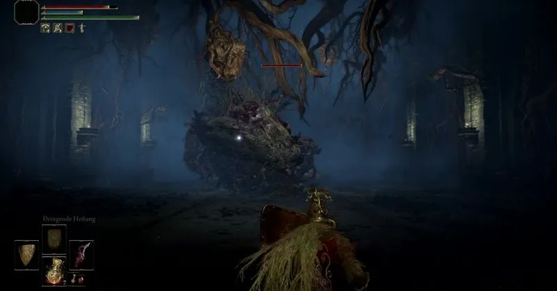 - Как только дух дерева становится полностью желтым, область прямо перед ним взрывается. Вам следует снова убежать, и с этого момента вы должны блокировать как физический, так и магический урон. К счастью, последний не так уж и велик, поэтому продолжайте блокировать все атаки и время от времени угощайтесь зельем исцеления.
