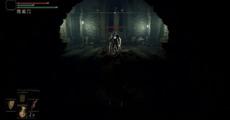 Награда за усилия: колеснице теперь нужно гораздо больше времени, пока она снова не примет вашу погоню. Вы можете безжалостно воспользоваться этим и броситься прямо на босса гробницы. Для этого пробегите по пандусу до конца и внизу поверните налево. Вы сразу же окажетесь на перекрестке, где снова свернете на тропинку слева. Просто пробегите мимо всех врагов и, наконец, поверните направо в нишу, где вас ждут столб марикаса и желтая стена тумана.