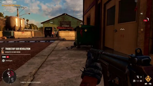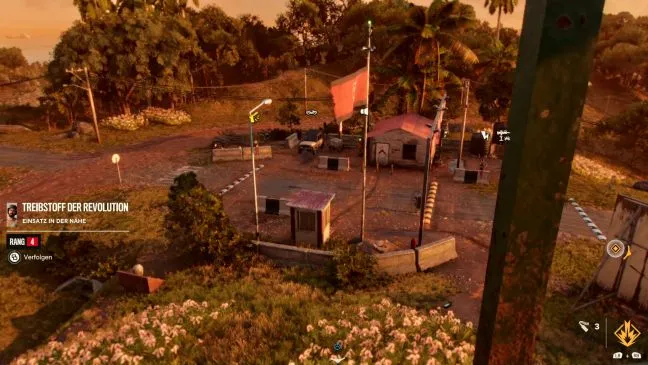Подойдите с севера и направьтесь к смотровой вышке, чтобы убить стоящего на ней охранника. Затем вы можете проверить контрольно-пропускной пункт по мобильному телефону и нацелиться на двух других врагов у пушек, которые вы видите на юге. Вы можете поджечь рекламный щит рядом с вами с помощью бутылки с зажигательной смесью.