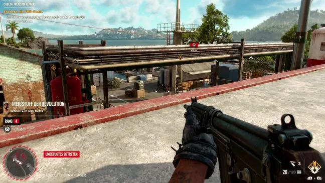 Сначала заберитесь на большой цилиндрический танк к югу от лагеря. Оттуда можно осмотреть его с помощью мобильного телефона и выцелить большинство врагов. Затем посмотрите по диагонали налево на вход с пушкой и подождите, пока за ним не появится охранник. Теперь можно спуститься вниз и по широкой дуге подкрасться к охраннику, чтобы убить его под прикрытием цветов.