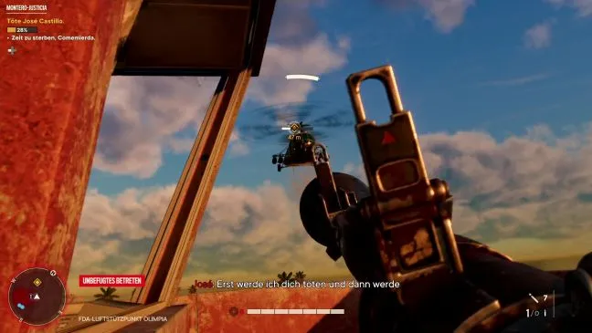 Хосе Кастильо, к сожалению, ведет нечестную игру и приседает в своем вертолете на безопасном расстоянии, стреляя по Вам из очень мощной скорострельной винтовки. Поэтому необходимо как можно быстрее добежать до дверной коробки, где вы будете в полной безопасности.