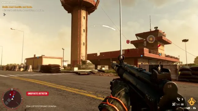 Поэтому сразу после сцены садитесь в самолет и направляйтесь к целевому маркеру. Как только вы окажетесь достаточно близко, он исчезнет, и появятся пять новых, каждый из которых будет обозначать одно из полей. Самое позднее, когда до первой цели остается 500 м, вы переключаетесь в режим бомбардировщика. Нацельтесь на каждое поле в отдельности и сбросьте на него бомбу. Этого должно быть достаточно, чтобы они загорелись и были уничтожены.