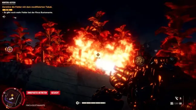 Теперь уничтожьте все остальные поля с помощью бутылок с зажигательной смесью, динамитных шашек или огнемета. После того как первые пять полей будут уничтожены, новый маркер приведет вас к финке Бустаманте на северо-западе. Там необходимо уничтожить три последних поля, для чего лучше всего обойти запретную зону.